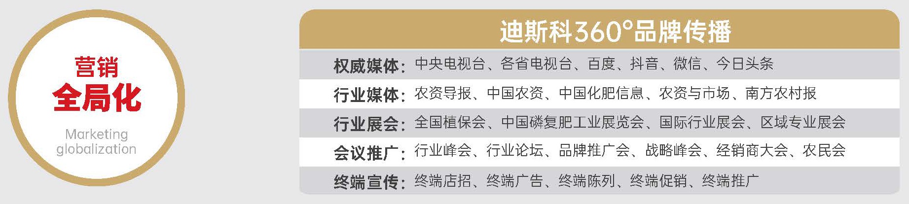 迪斯科专注于农业科技的研究应用以及农业相关领域的事业发展,重点聚焦高端肥料领域的顶尖科技和前沿发展方向,用科技创新推动现代农业的可持续发展。迪斯科始终立足中国,在中国设有湖北宜昌、湖北枝江、河北廊坊、甘肃金昌4大生产基地,形成“一主两翼”、南北呼应、陆海联动、互联互通的产业布局。同时,积极拓展全球战略布局,通过设立全球办事机构、建立全球技术合作、开展行业技术交流、加强国际贸易往来、深化企业战略合作等举措,构建优势互补、多方共赢的大农业生态圈,协同发力,创造更高的价值,为世界农业长远发展持续赋能。