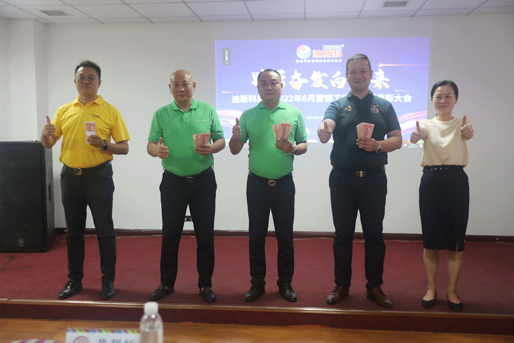 本次培训活动的最后一项议程——迪斯科集团2022年6月营销工作总结表彰大会在7月13日顺利召开。集团总裁办主任黄利红、全国营销管理中心总经理胡红涛、总裁办副主任蒋慧等领导出席会议,各销售公司负责人及区域营销精英参加会议。