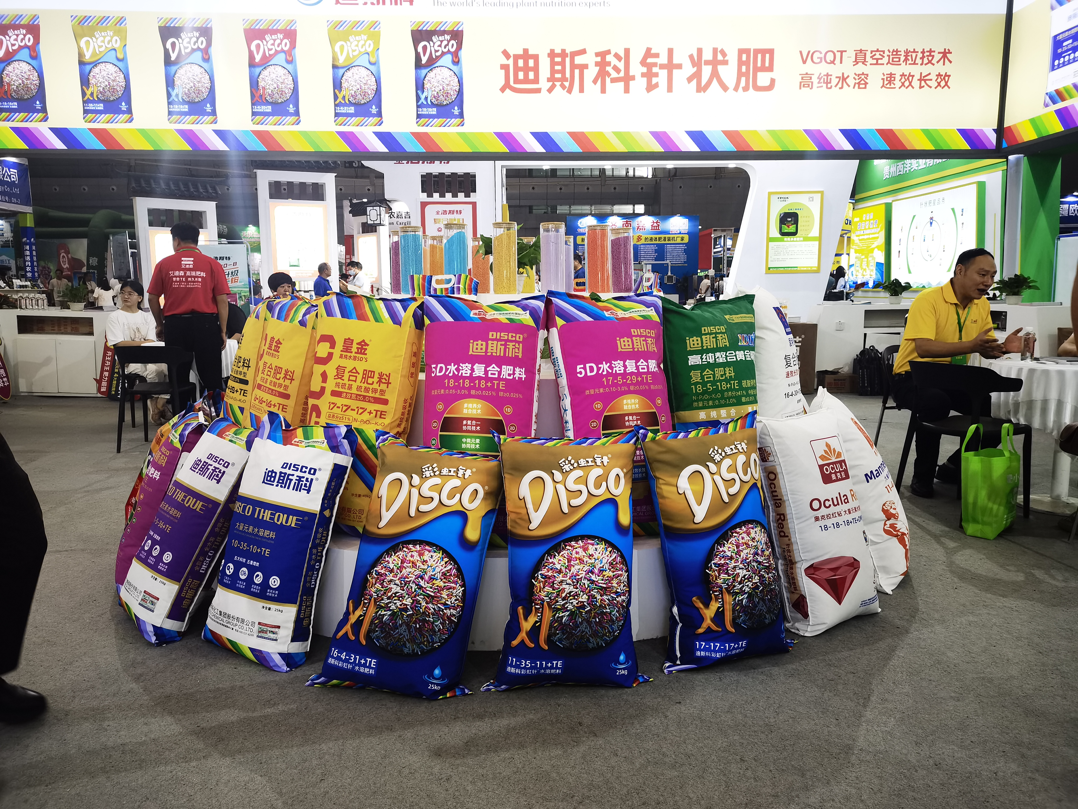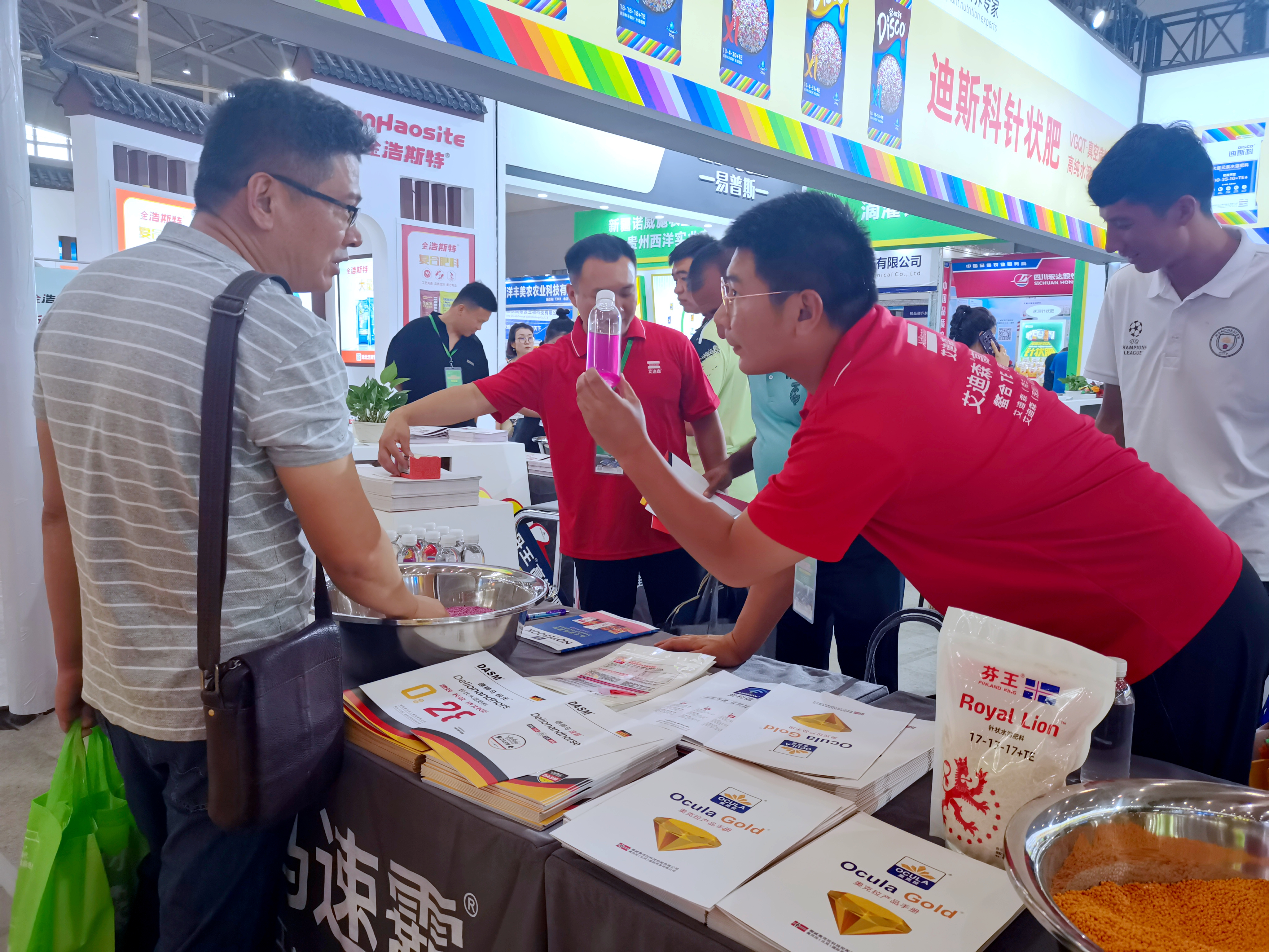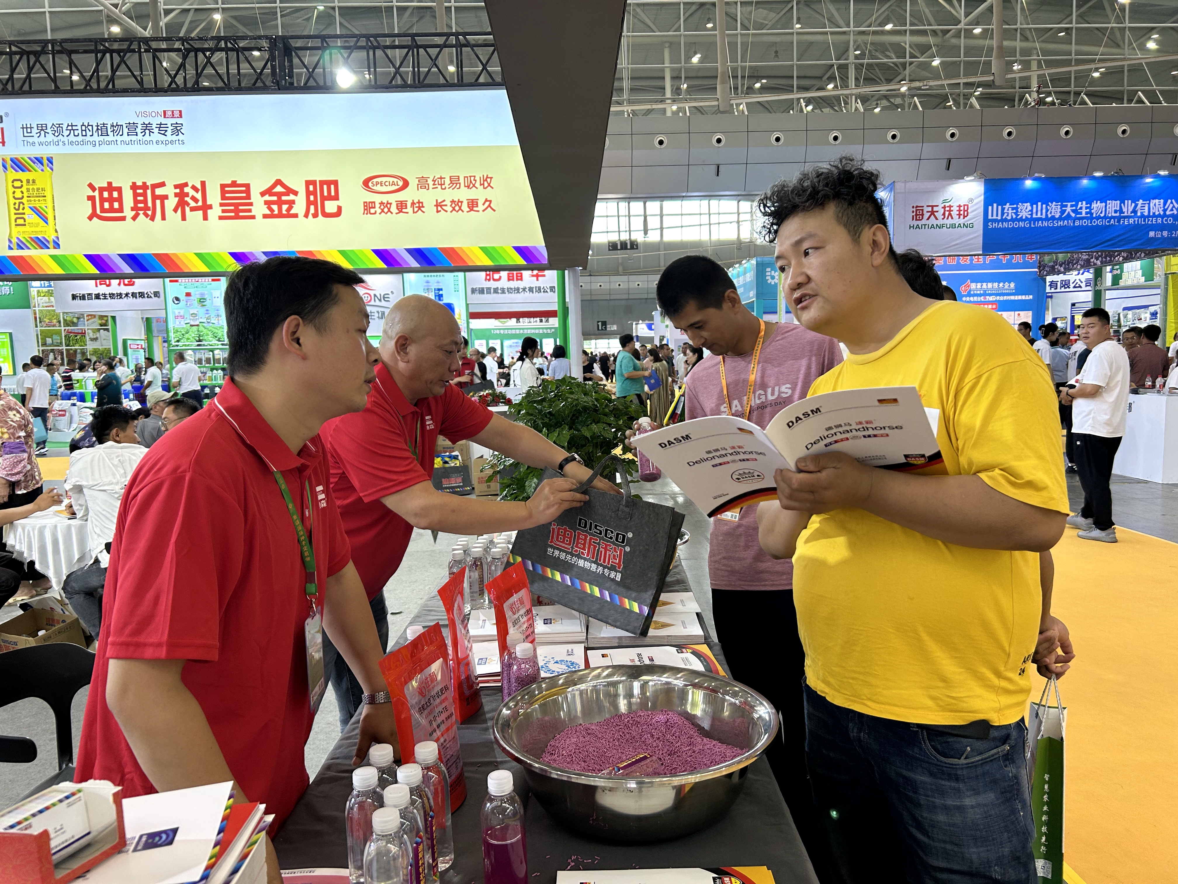 迪斯科响应国家号召,大力发展绿色高效的高端新型肥料。参展的5D水溶复合肥料,皇金水溶复合肥料,大量元素水溶肥、彩虹针针状水溶肥料等系列高端产品,肥效好,可以有效解决新疆地区土壤肥力不足、缺水、土壤盐渍化等问题,产品的水溶性通过现场检验,得到参展嘉宾的一致好评。