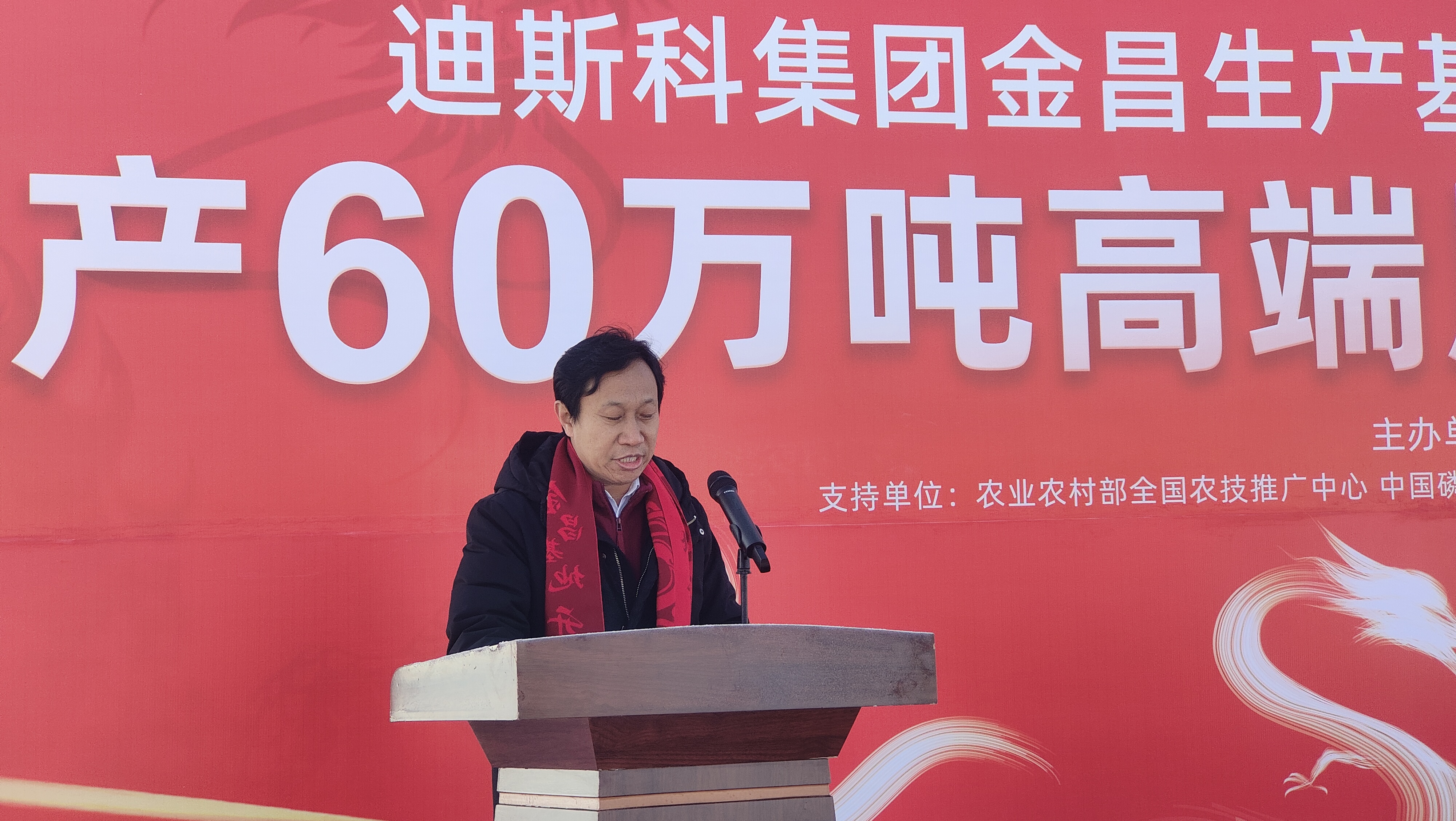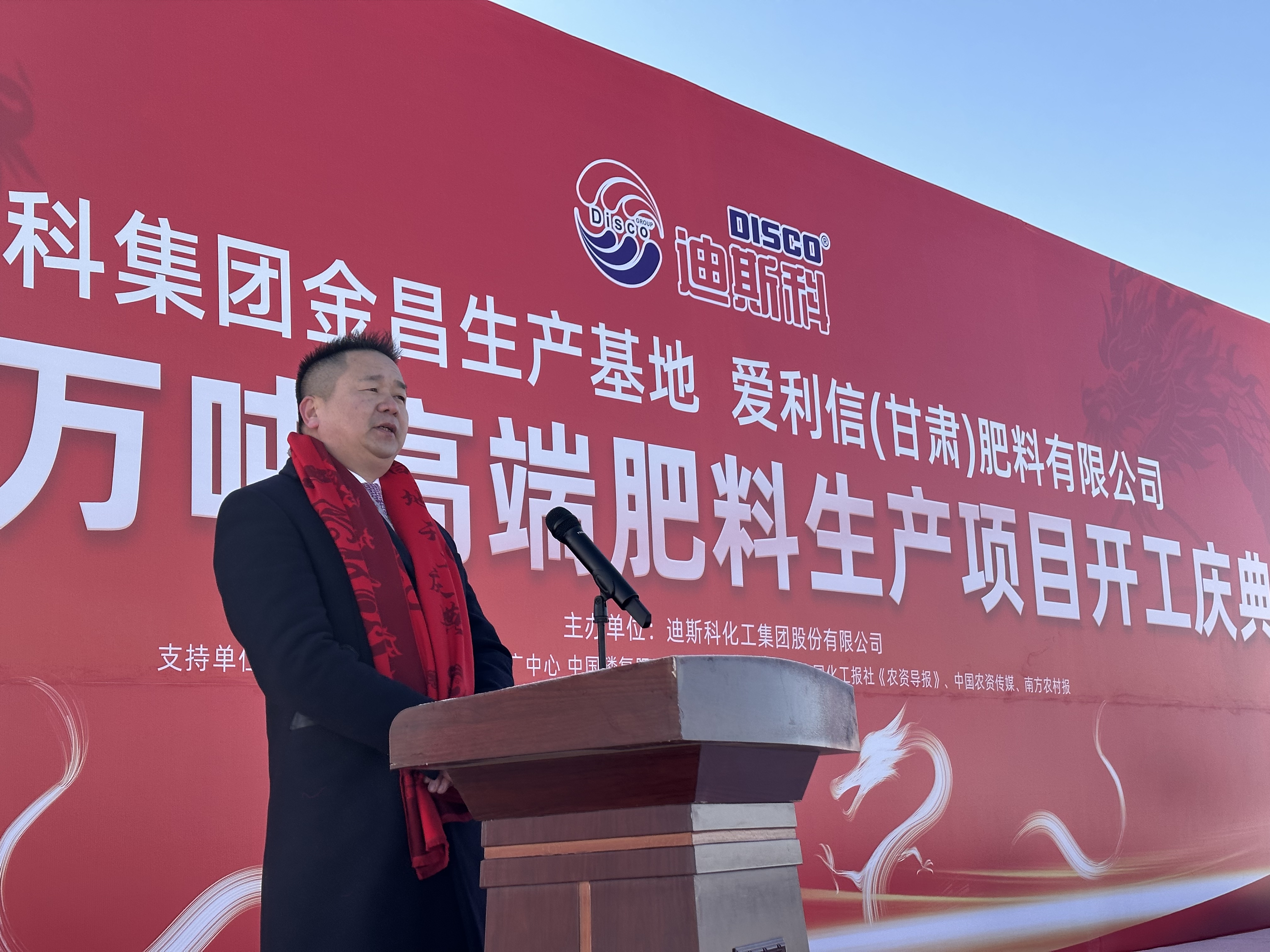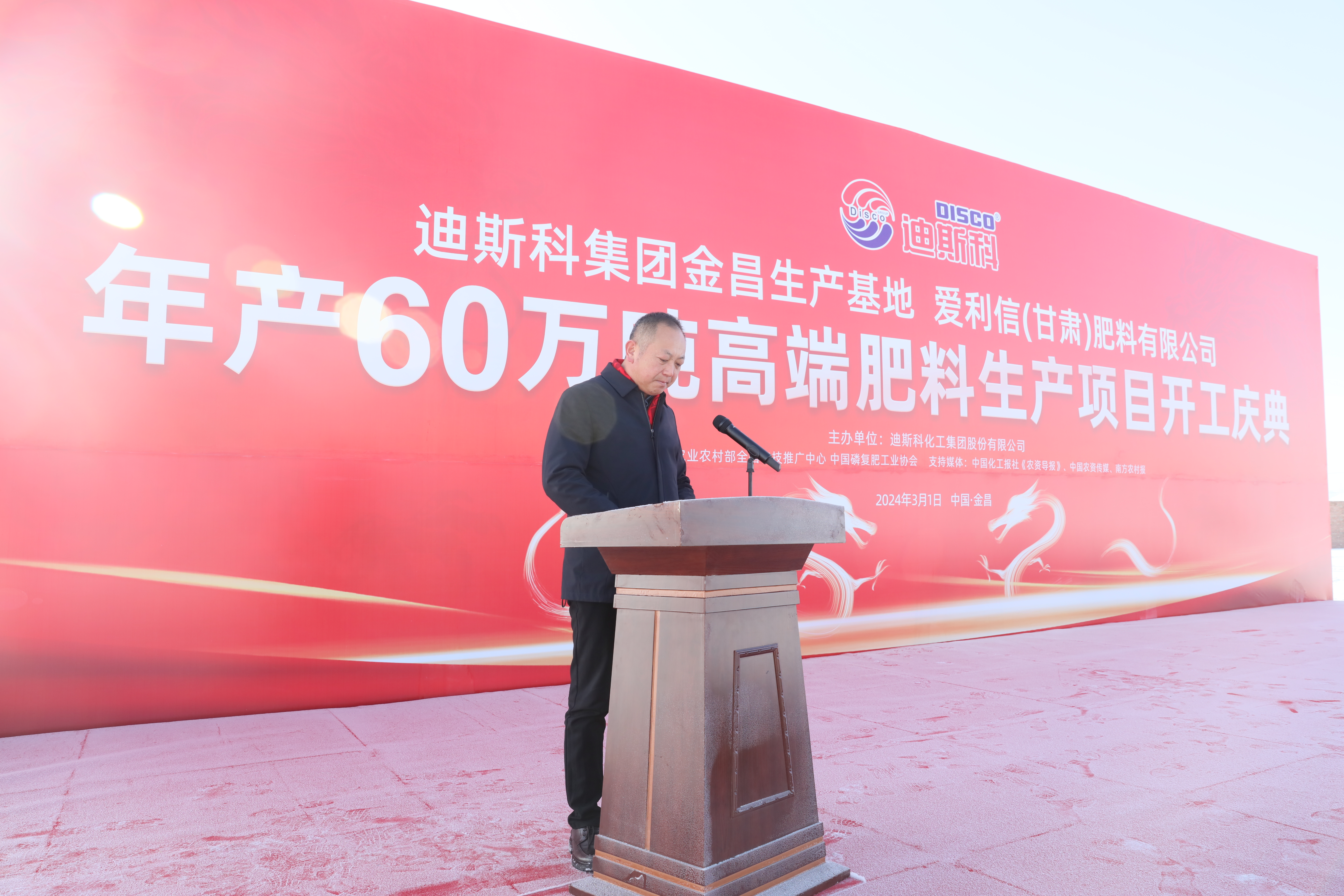 永昌县政府副县长李孜锋发表讲话:我谨代表永昌县委、县政府,向迪斯科集团金昌生产基地年产60万吨高端肥料生产项目的顺利开工,表示热烈的祝贺!该项目将对夯实全县百亿产业图谱提供强大引擎,为永昌工业园区打造全省样板奠定坚实基础,也必将为永昌全面转型高质量发展注入强劲动力。希望迪斯科建一流工程、保一流质量、树一流品牌,全力打造地企共赢的精品工程、示范工程、样板工程。