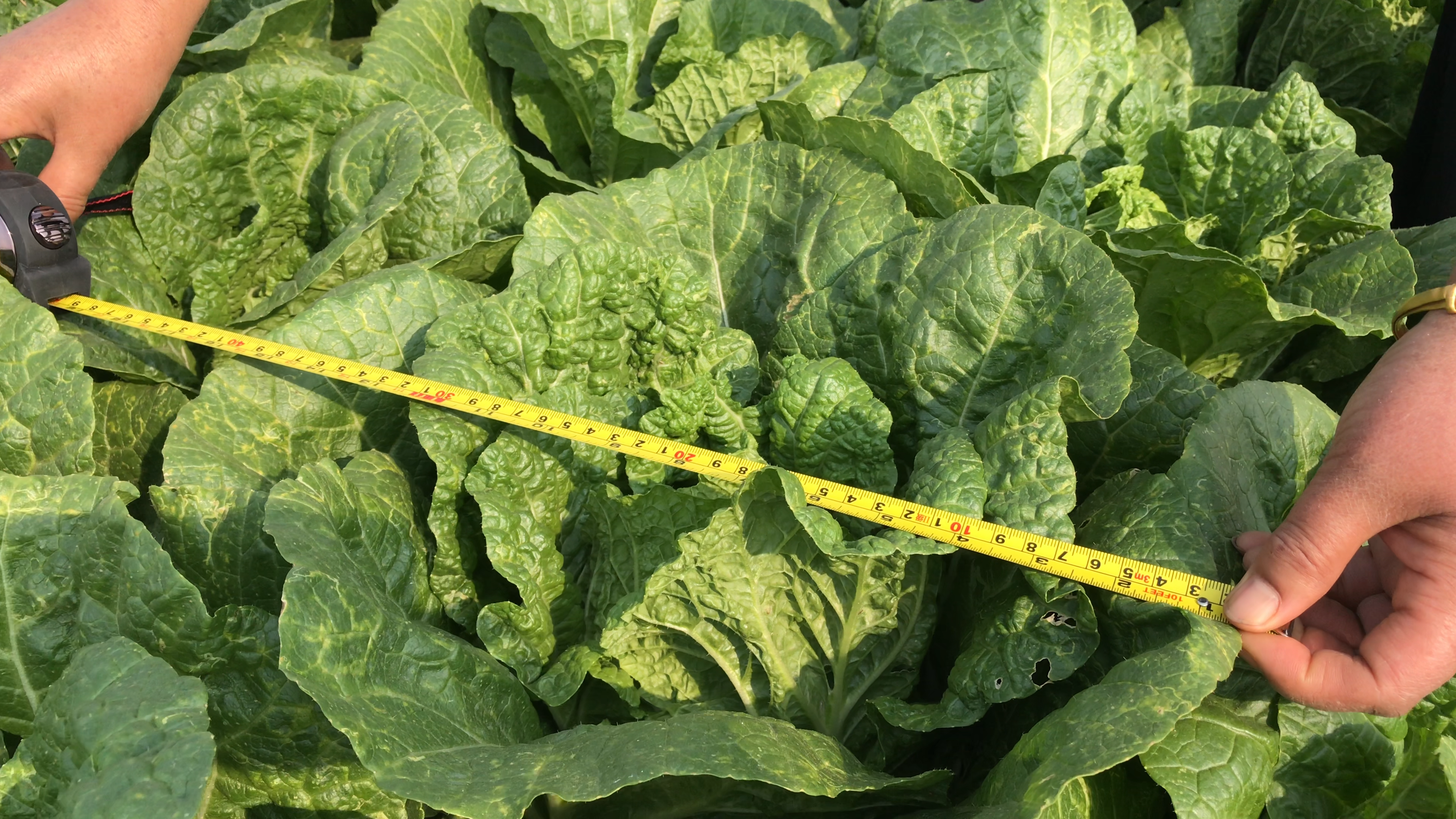 白菜滴灌迪斯科5D水溶肥料高氮高钾型配方,采摘期前单棵舒展直径达到40公分,高度超过30公分,大叶叶面宽度达到27公分,叶片厚实、叶层多、颜色油亮、口感脆。