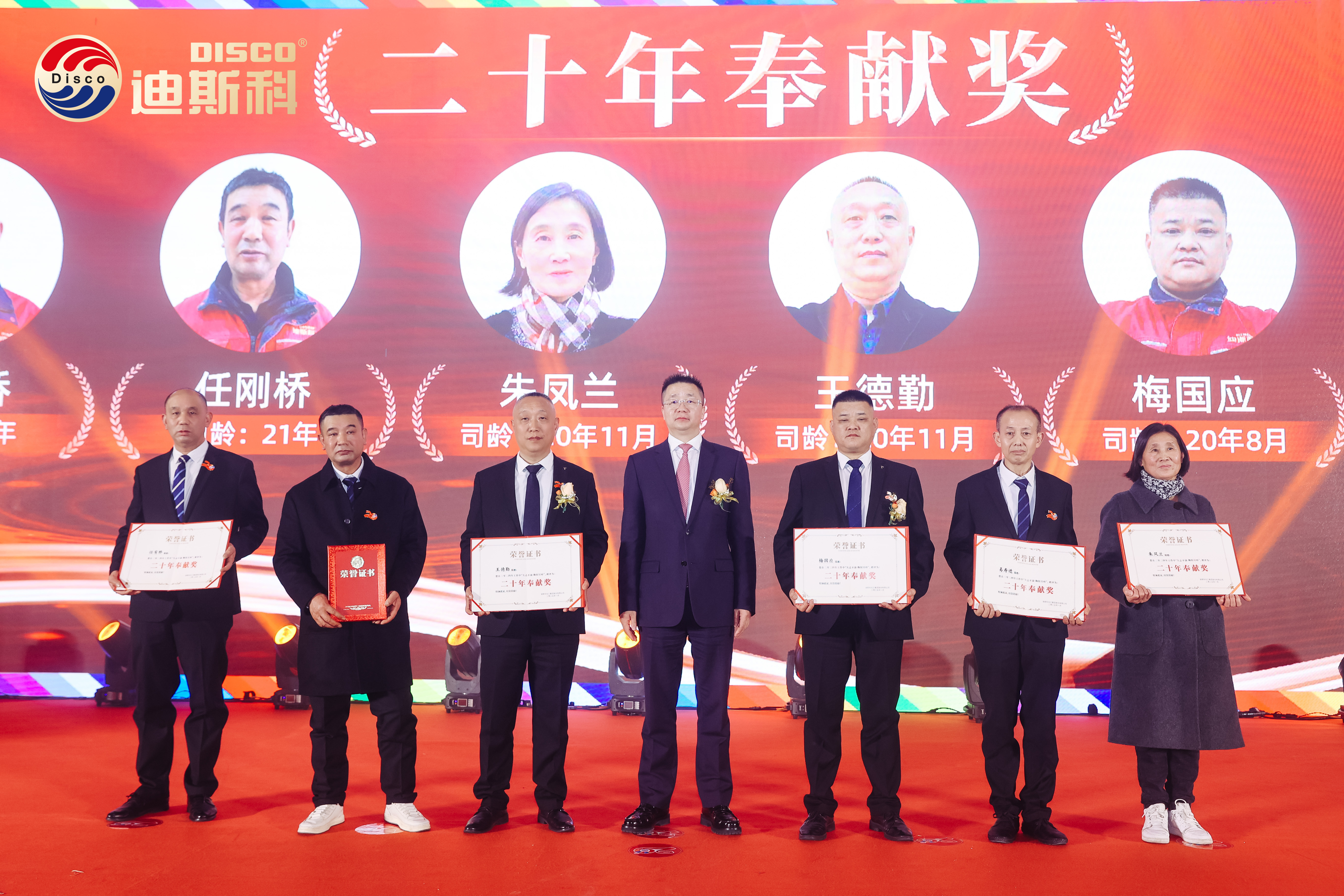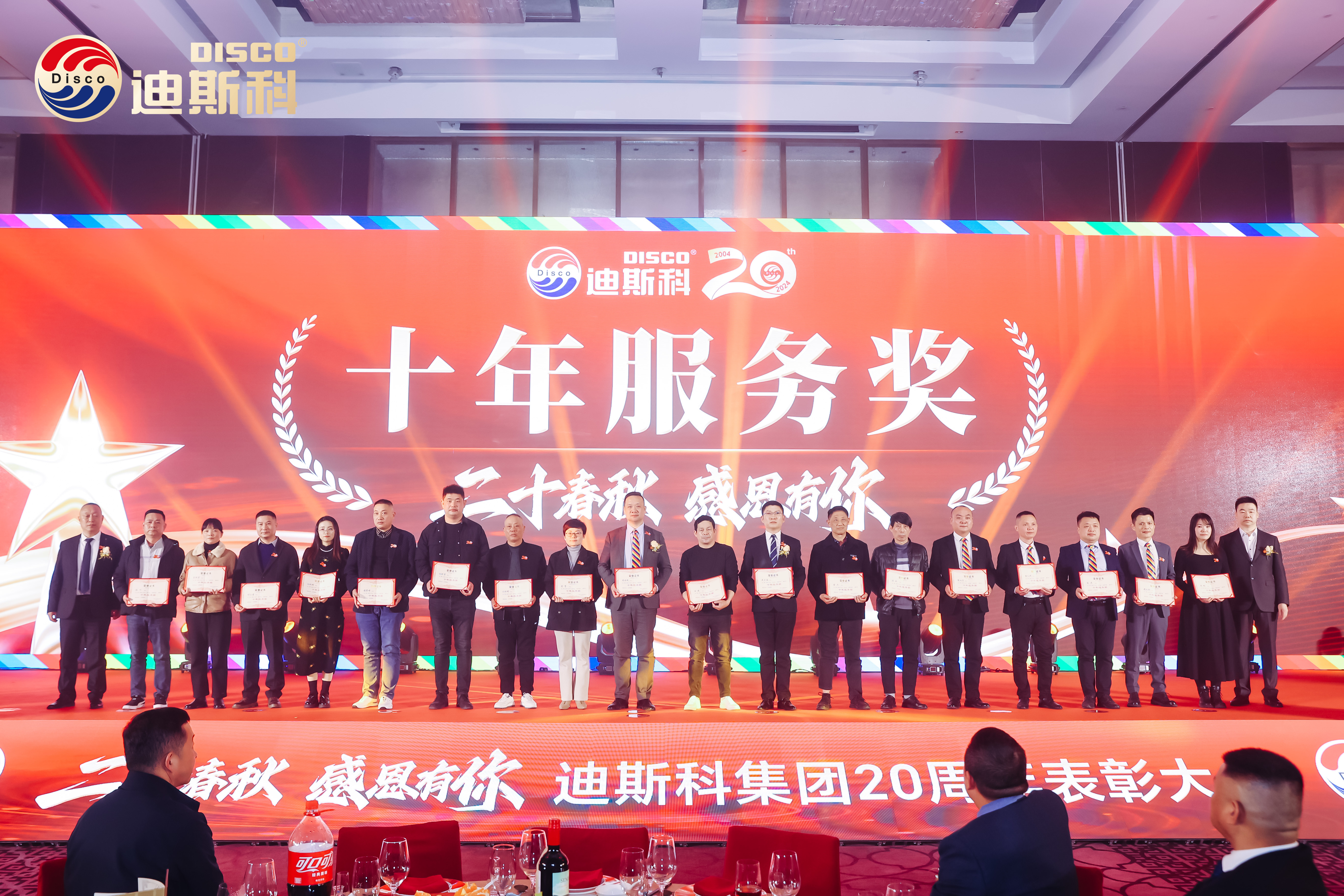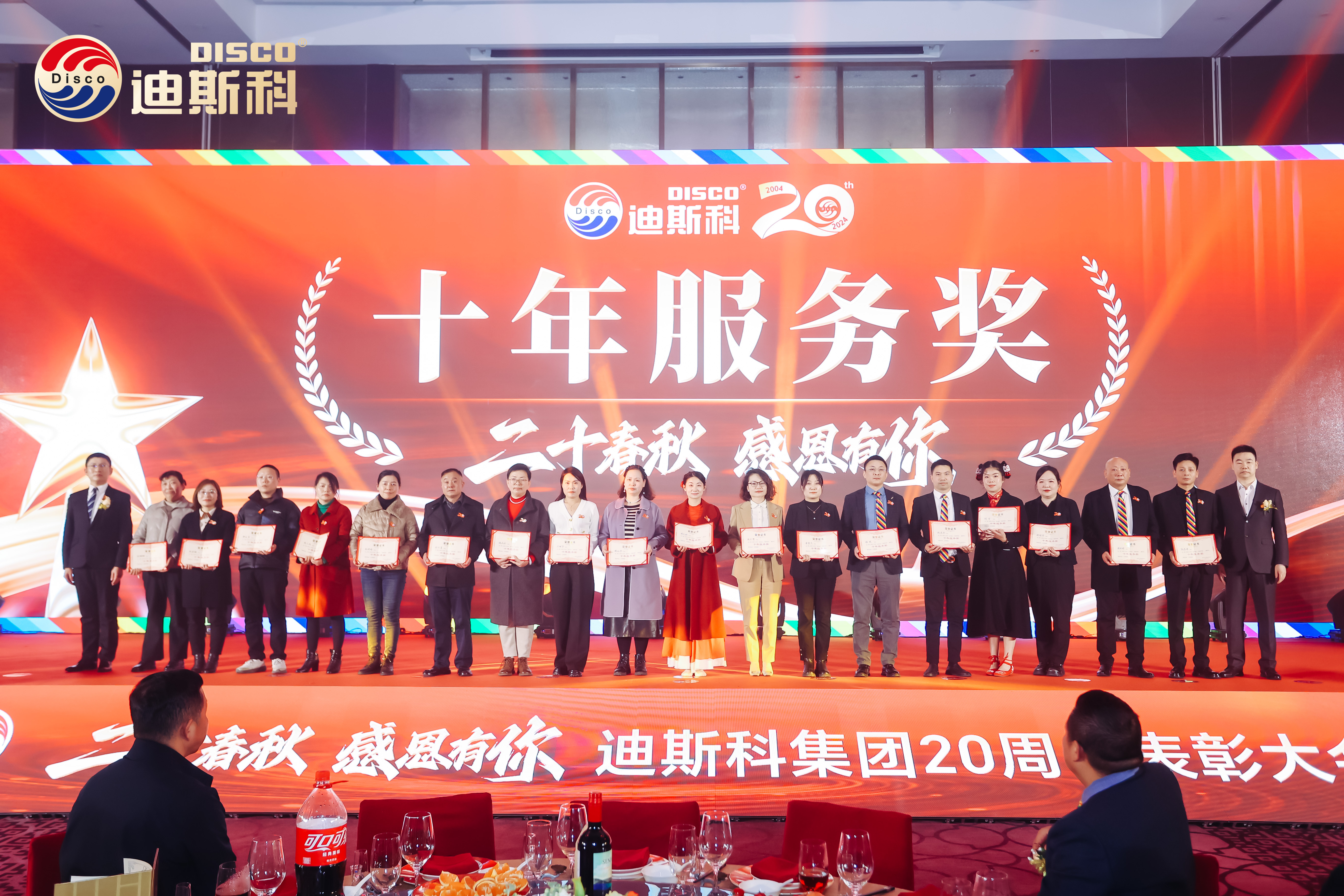 在20年的风雨征程中,为感谢员工的始终相随和忠诚奉献,迪斯科集团为入职10年以上的员工颁发“十年服务奖”,为入职20年以上的老员工颁发“二十年奉献奖”。