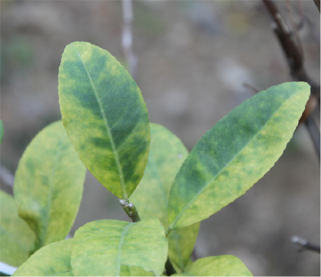 最新研究表明,黄龙病病菌属于不可体外培养的革兰氏阴性菌,症状为叶片斑驳状黄化或均匀黄化或黄梢(以夏、秋梢发病最重,其次是春梢,幼树冬梢也发病,9月至次年2月是症状明显时期)红鼻果、青鼻果等典型症状。柑橘一旦感染黄龙病,只能砍伐处理。